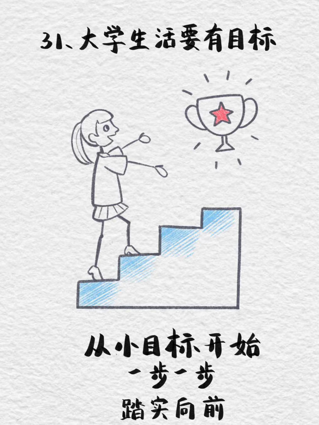 31.大学生活需要有目标🫵🏼。不要总是觉得目标很虚,很空。一个人是否有目标,对待生活的态度是截然不同的。上大学后要给自己的每天、每周、每月、每学期💁🏿♀️、每年都定一些目标💅,有了目标,你的生活就会过得更充实😊。记得哦🧧,可以把目标进行分解👋🏿,越细越好,从小目标开始🦿,一步一步脚踏实地向前走🥣。
