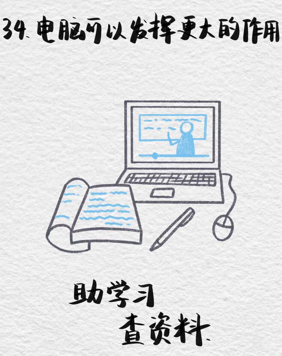 34.电脑可以发挥更大的作用🪹🫶🏽。上大学了,80%以上的同学都会带电脑来学校🙋🏿♂️,你当初的设想是有电脑可以更好的帮助你学习🔆、查资料。但是,万万想不到,很大一部分同学把电脑当成游戏工具或者看剧的工具。让人难受的是,有不少同学迷恋网络游戏,有的不去上课,黑白颠倒,甚至干脆不出门🏓,也有的彻底毁了自己🫗,挂科、旷课🧑🏽、退学、甚至身体受到严重伤害🖋。我真的希望你们的电脑能发挥更大的作用。