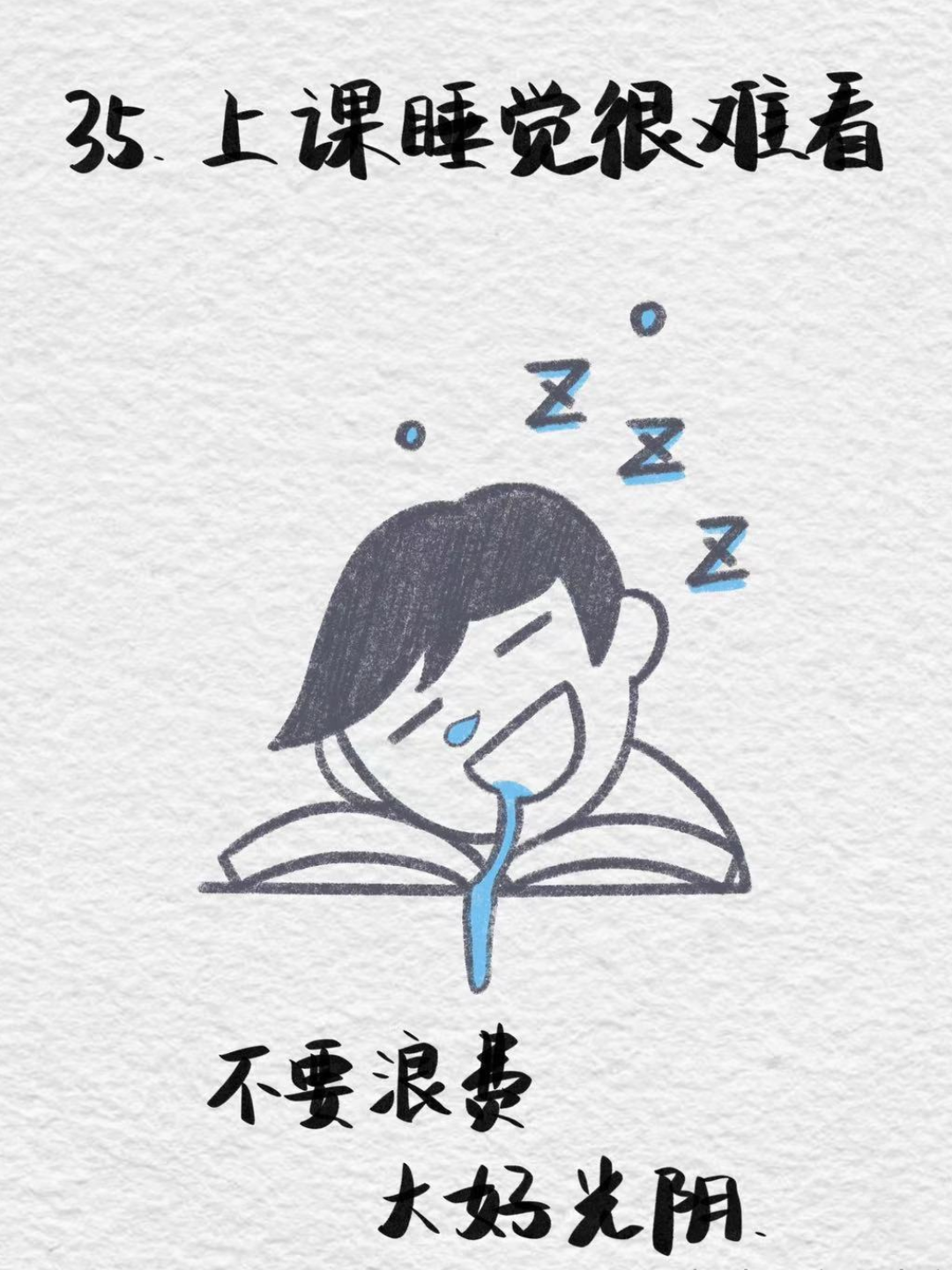 35.上课睡觉很难看。上大学一段时间后你可能会在上课时睡觉。大学初体验🐾,你可能有些失落,可能很迷茫,可能对课程没兴趣,也可能老师上课你不喜欢,也有可能晚上你把精力都放在游戏和刷剧上🧑🏼🌾,白天没精神上课。我希望的是你能自律,尊重每一位老师,永远不要嘲笑你的老师无知或者单调,因为有一天当你发现你用瞌睡来嘲弄老师实际上很愚蠢时🤵🏽,你在社会上已经碰了很多钉子了。再者,如果你实在听不下去,你可以做自己的事情👮🏽,可以自己看书。总之,不要浪费大好时光就行🚵🏿👯♂️。