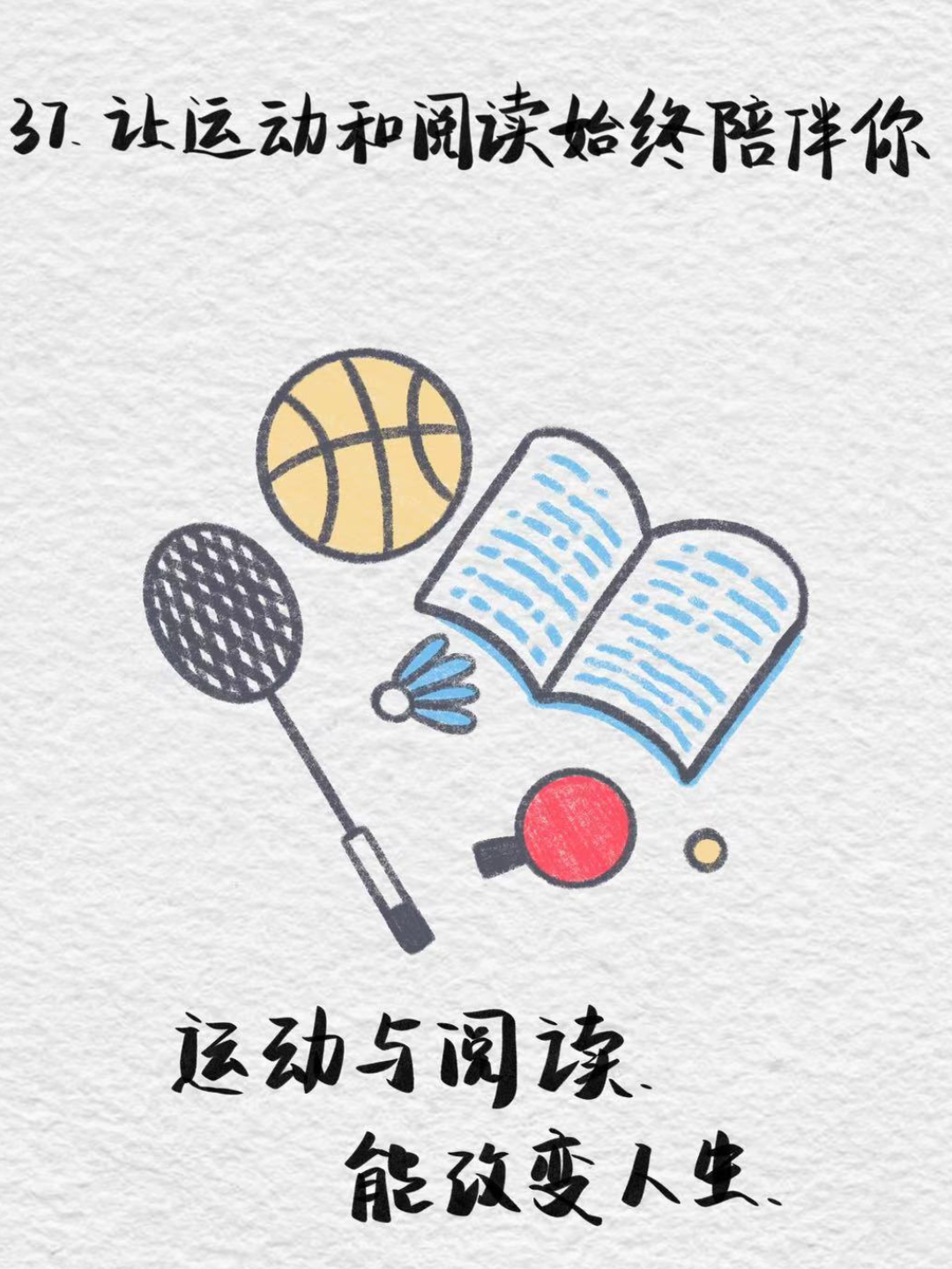 37.让运动和阅读始终陪伴你。运动可以改善情绪🕵️♀️,调节情绪🙅🏿,促进身心和谐。每天运动半小时以上,坚持一段时间,它将改变你的人生🤾🏻♀️。阅读可以说是最简单、消费最低🧊、最有效果、且意义最佳的一种排解方式。通过阅读,不仅有助于缓解情绪👩🏿✈️,还可使人增长知识与乐趣,阅读能够增加自己的阅历🚱,你可以从书中获得处理情绪的智慧🦸🏻♂️,这个时候你不仅收获了情绪的平静,更收获了知识,因为有了收获,你的心里也会感到十分满足👊🏻,情绪不好时,停下来,阅读一本好书!阅读会照亮你的心灵。