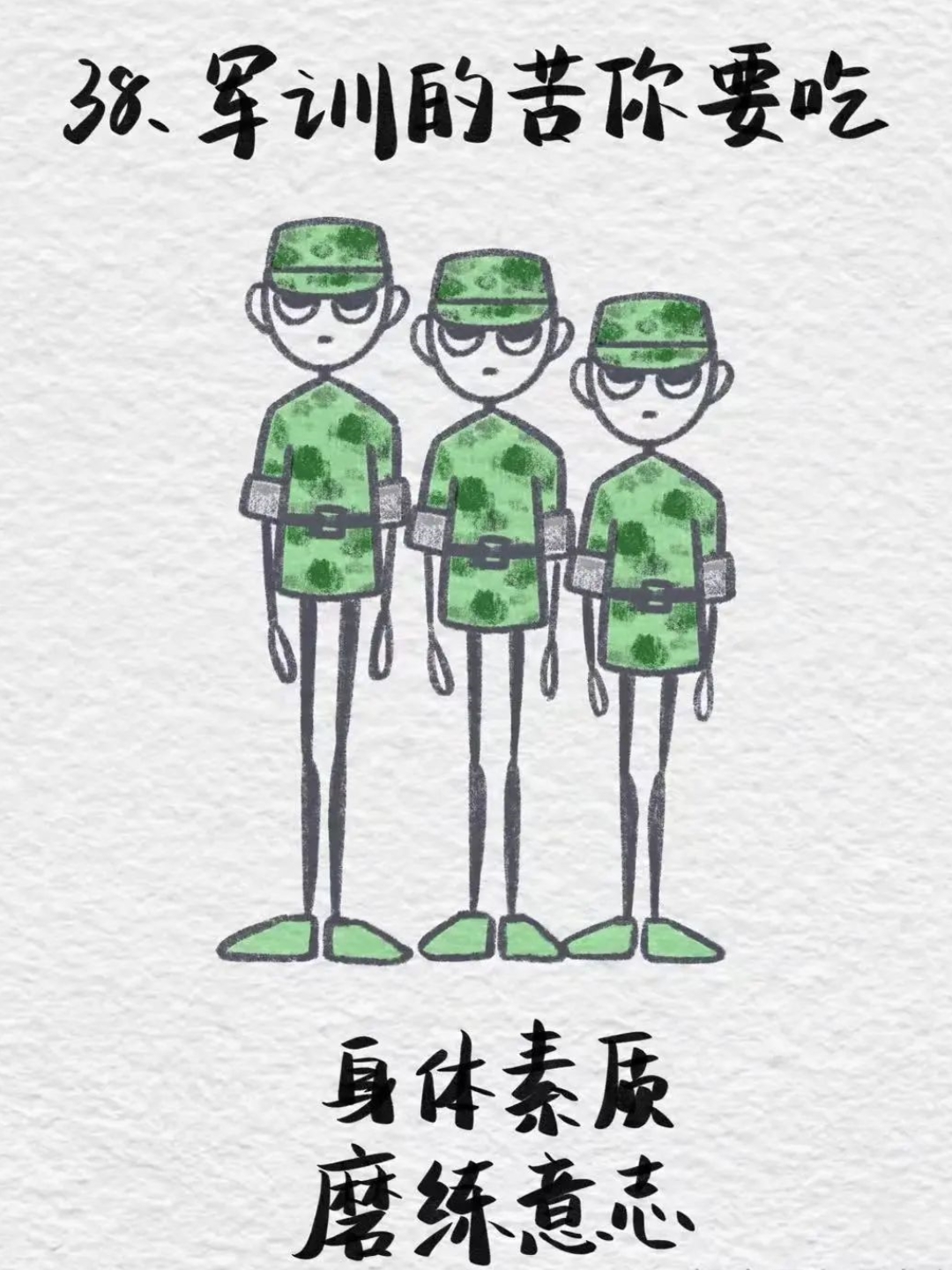 38.军训的苦要吃👨🏽⚕️。军训是你们入学的第一课🤾🏻♀️,是你们接受国防教育的一课👨🏼🎨,也是提升你们身体素质的一课👰🏻,更是磨练你们意志的一课。至于苦与乐,只有经历过的人才知道其中的感受。等你走过军训这段时间,你才会怀念那一段短暂的时光⛏,它会给你留下很深刻的印象,美好的回忆↪️。所以🤶🏽,希望大家好好珍惜,不要以各种理由申请免训,或者总是找借口坐在旁边观看,抑或是一点点小困难就坚持不了🦸♂️。