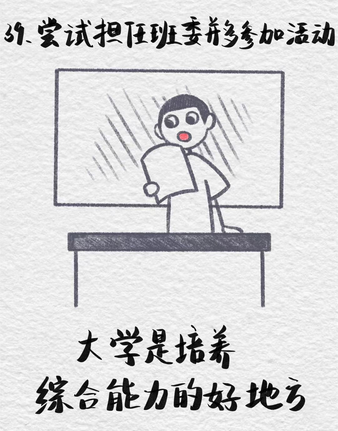 39.尝试担任班委并多参加活动🧑🏻🔧。前面已经说过,大学是培养你综合能力的地方,大一新生的你,我建议你们积极去竞选班委或者学生会干部,你需要通过班委或者学生会干部来提升自己的综合能力。当然,不管你做什么,都请用心的、负责任的去做,这样才对得起你自己🦂,对得起选择你的同学。另外,请你一定要积极的去做事情,去服务同学🟨👨🏽🎨,只有这样才能真正的锻炼到自己🚵🏿。同时,我也希望同学们积极参加学生活动或者比赛💻,通过参加活动或者比赛提升自己的能力,同时结识朋友和获得个人自我成就感🕺🏽。可根据自己的兴趣或者专业发展参加社团活动😯,记得社团活动适度就好,选择后再投入、做精,这对自己是一个拓展。