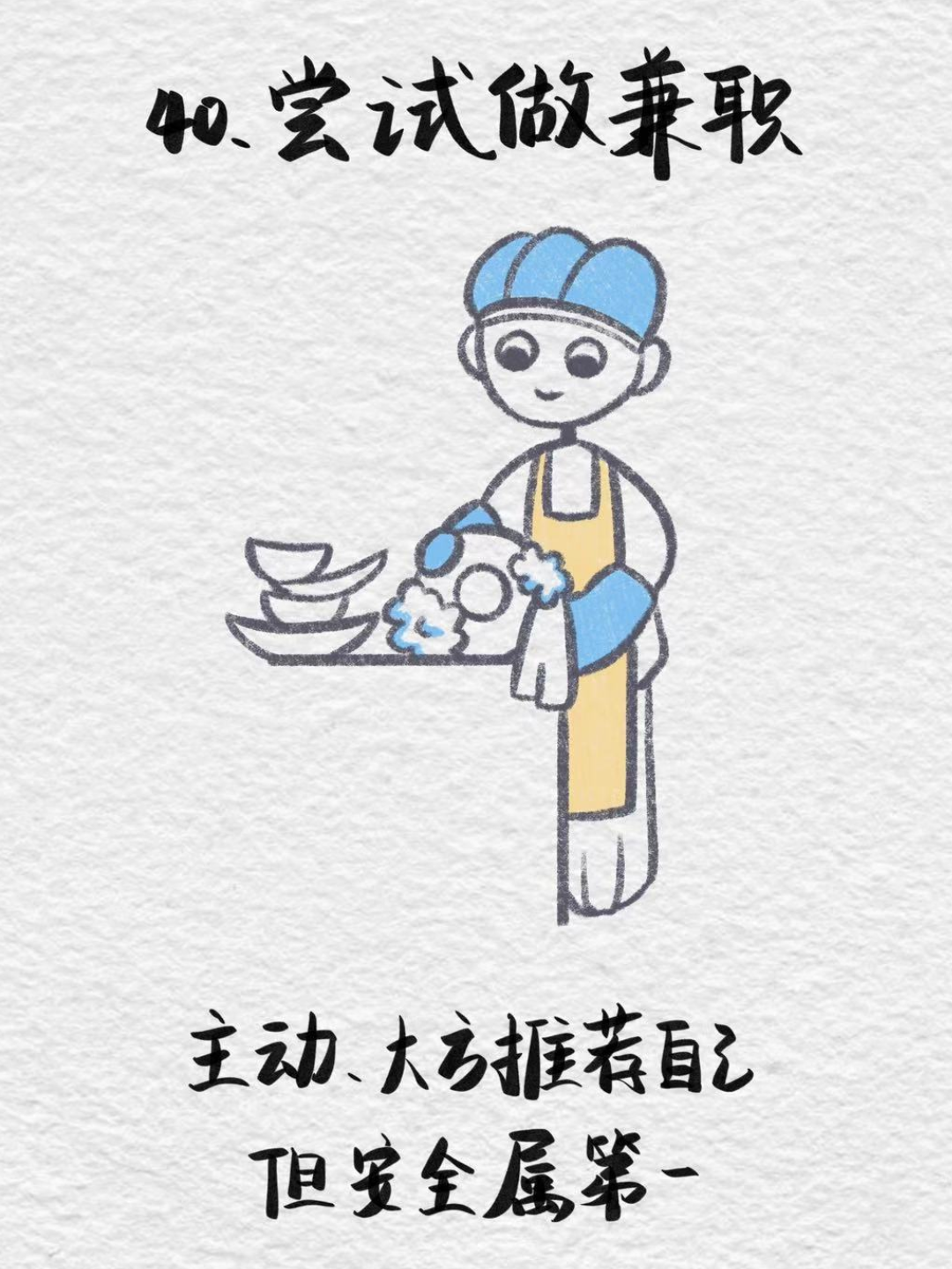 40.尝试做兼职⚧。上大学的你是不是也想做做兼职,为自己挣点生活费呢?这很好啊,兼职的种类有多种,你要有所选择⛓️💥,如:校外的兼职——家教📛、服务员🏊🏿♂️、送快递等;校内兼职--勤工助学岗位、校内送餐等等🤷。兼职确实能提升自己的能力🤰🏿,还能获得一定的收益👮🏼,能减轻家庭负担,也能提前接触社会🏃➡️,这是好事,有机会可以去尝试🦒。当然,做兼职一定要留个心眼🛄,不要被骗了👩🌾,安全是最重要的。所以👨🏿🌾,建议最好在校内做兼职🐧。记得哦👱🏿♂️,校内勤工助学岗位是比较多的,你要自己主动、大方的去推荐自己🤱。