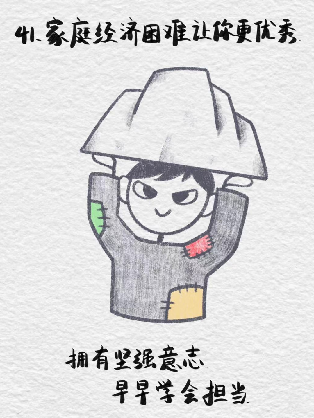 41.家庭经济困难让你更优秀。家庭经济困难也许在当下给你带来了一些困扰。但是,家庭经济困难的孩子有坚强的意志,懂得知足常乐📄,渴望美好生活,努力上进🙎🏿♂️,早早就学会了承担责任。所以不要妄自菲薄,变的自信一些,要有自己的目标与梦想👳🏽♀️,并且要求自己不断为之而努力。当然,如果你的家庭经济条件一般🛬🥉,永远别乱花钱。