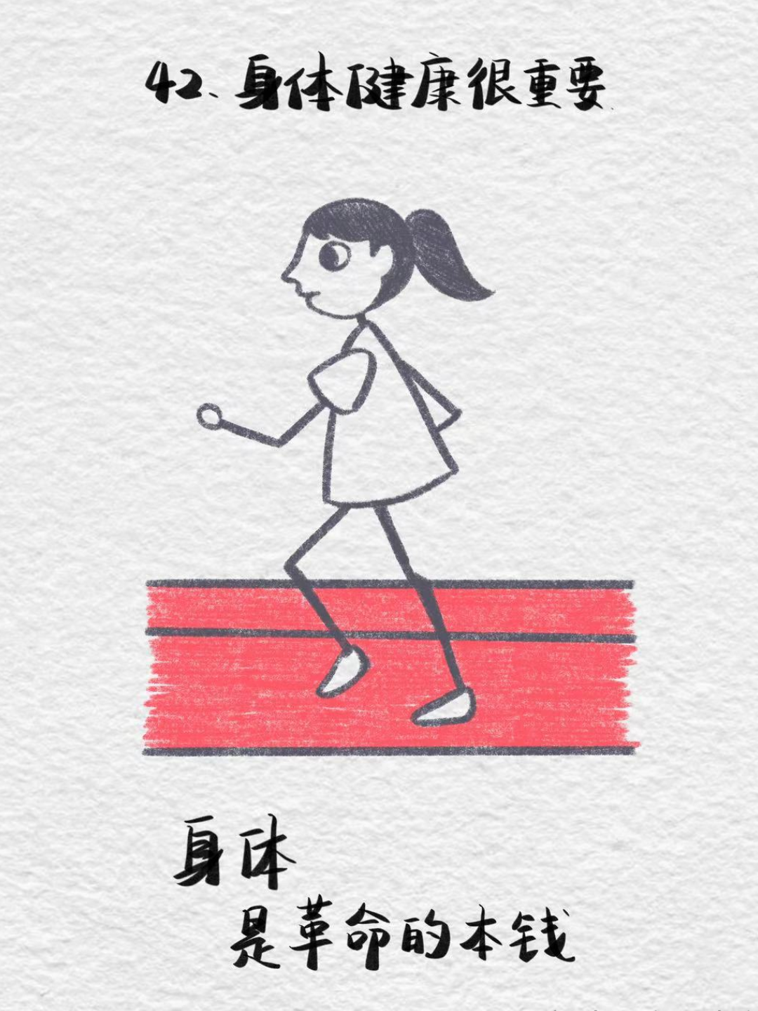 42.身体健康最重要。上大学后,没有了父母的唠叨和监督,你可能会疯狂熬夜打游戏、刷剧、逛B站等。不要总是那么懒🤫,总是点外卖,也不要那么贪吃,路边摊的东西不一定好。虽然这是生活的一部分,但是请大家适度。尽量规范作息时间👱,按时睡觉🧜🏿♀️,按时吃饭,身体不舒服了要及时重视5️⃣。一定要每天抽出点时间来运动,身体健康了,你才能完成其它的梦想。