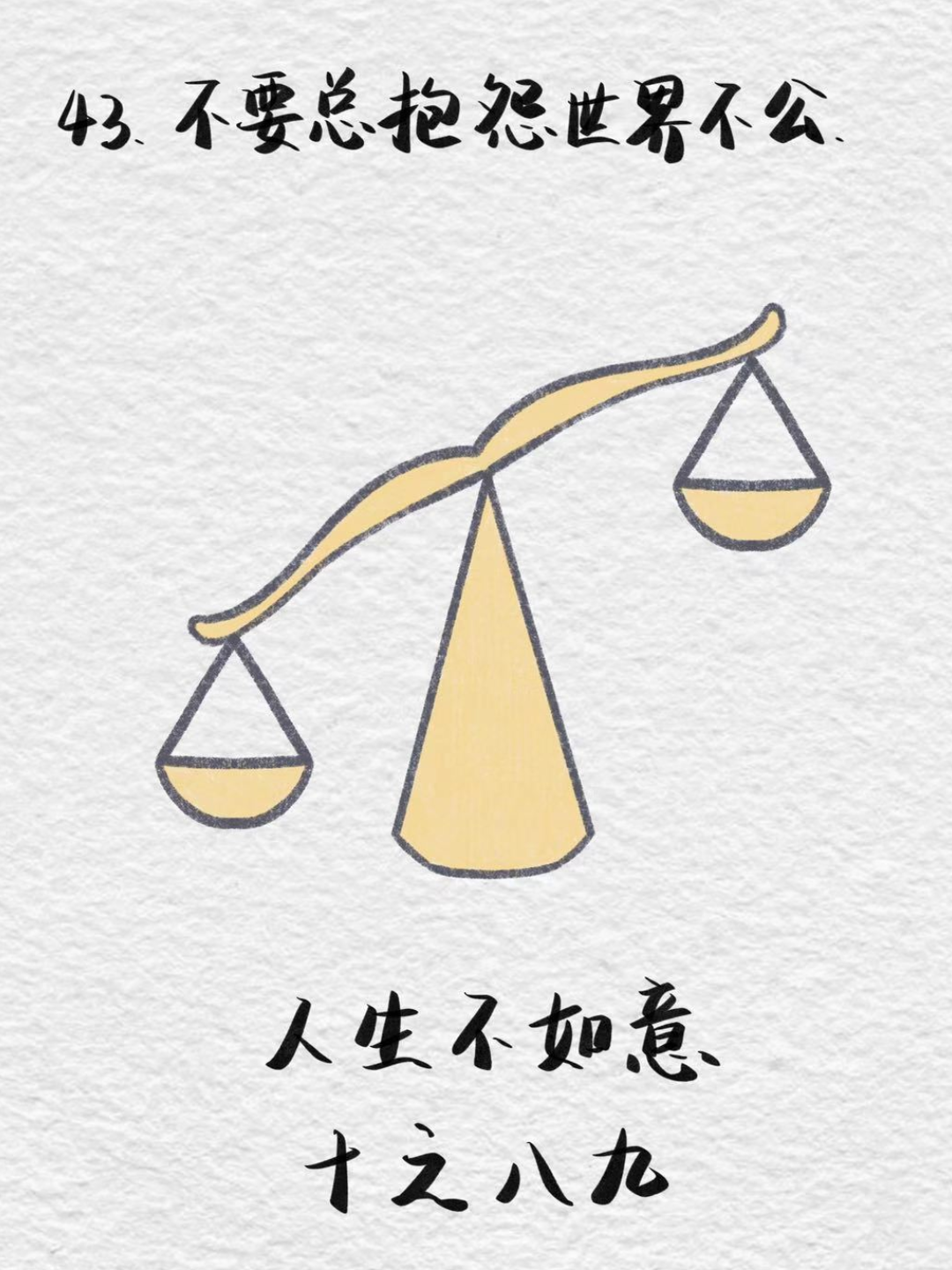 43.不要总抱怨世界不公平。大学就是一个小社会,你可能会发现一些不公平,也会发现不少你看不惯的东西👨🚒,人生不如意十之八九,这很正常🧲🤴🏽。面对不公平的事情♿️,不要抱怨,你所认为的不公平可能恰恰是别人的公平🤔,所以⛱,你不如去努力的奋斗👨🏫,争取属于你的公平。一个人在一些地方获取了什么💣,注定要在另一些地方失去些什么,这只是时间的问题👾🎗。任何时候都要学会一分为二的看待问题🍼,不要钻牛角尖,记住该记住的,忘记该忘记的,改变能改变的🧑🎄🙅🏻,接受不能改变的,用智慧去分辨两者⚪️;时刻保持微笑,它会为你带来幸运📺。