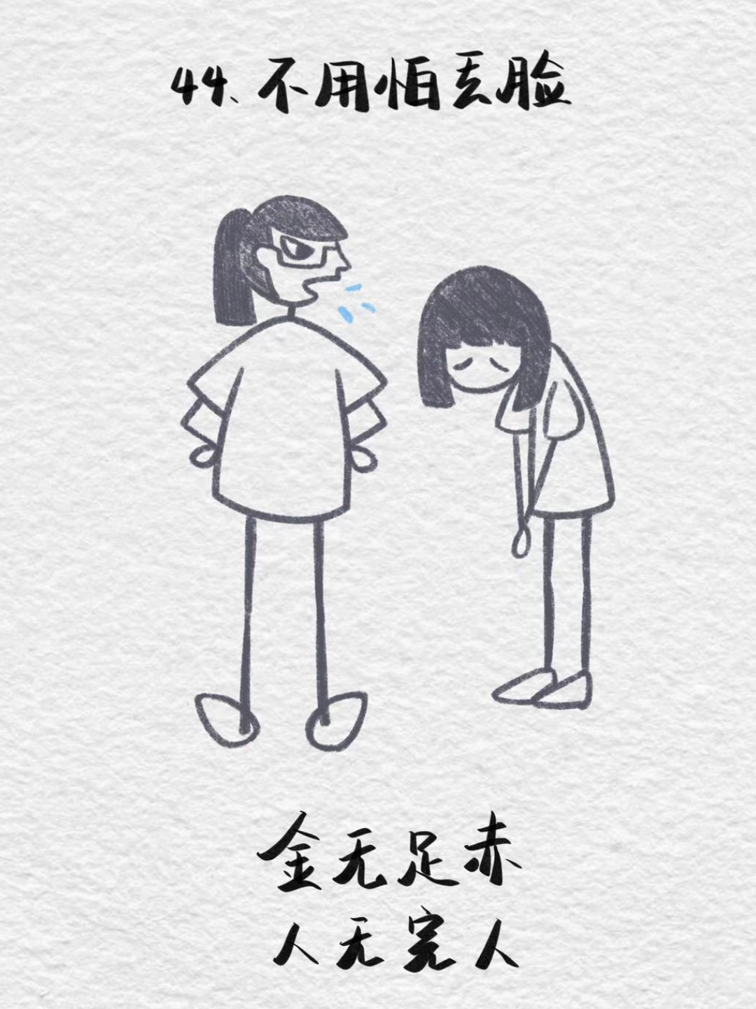 44.不用怕丢脸。永远别渴望做个任何人都不得罪的人,这不可能👸,事物都有两面性🚶➡️,任何事都有人反对,也有人支持,这是不可能十全十美的。有时候在大学里你的尊严可能会被打碎,这不重要,重要的是你要让自己的尊严有足够大的承受力🧖🏿♤,而且你要相信在大学里你的“丢脸”也许换来的是一次教训🥦、一次激励,大家不会去记得这些事情🥸,但等进入社会之后再发生“丢脸”的事情可能就真的是“丢不起”了🥢。