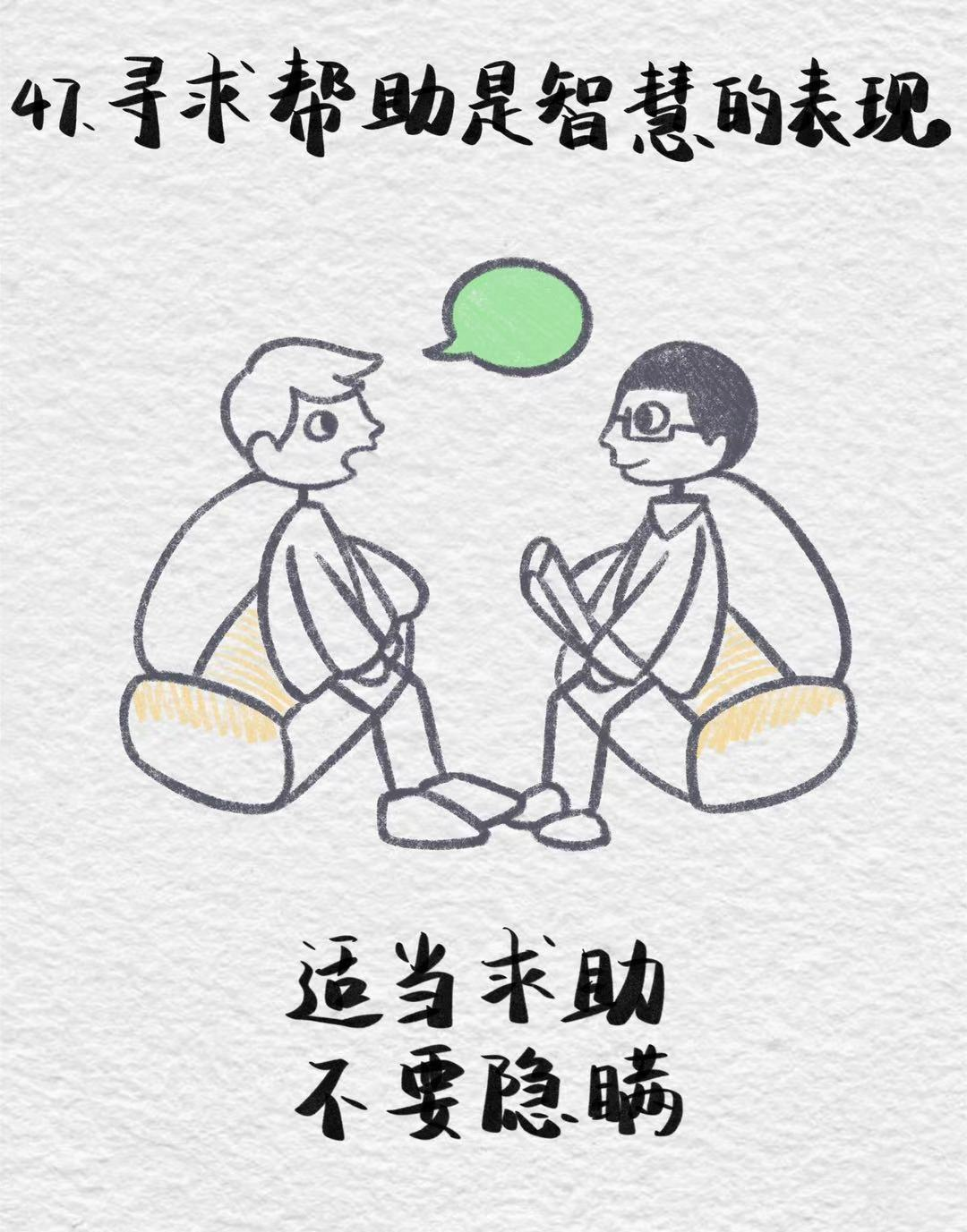 47.寻求帮助是智慧的表现。国家卫健委发布的心理健康素养十条中🧴,有一条明确说明,懂得求助是一个人智慧的表现🏤。如果你有心理困惑2️⃣,要根据自己的情绪表现和症状特点,适时适当的求助,不要隐瞒疾病,也不要扩大疾病的症状,及时寻求专业帮助。