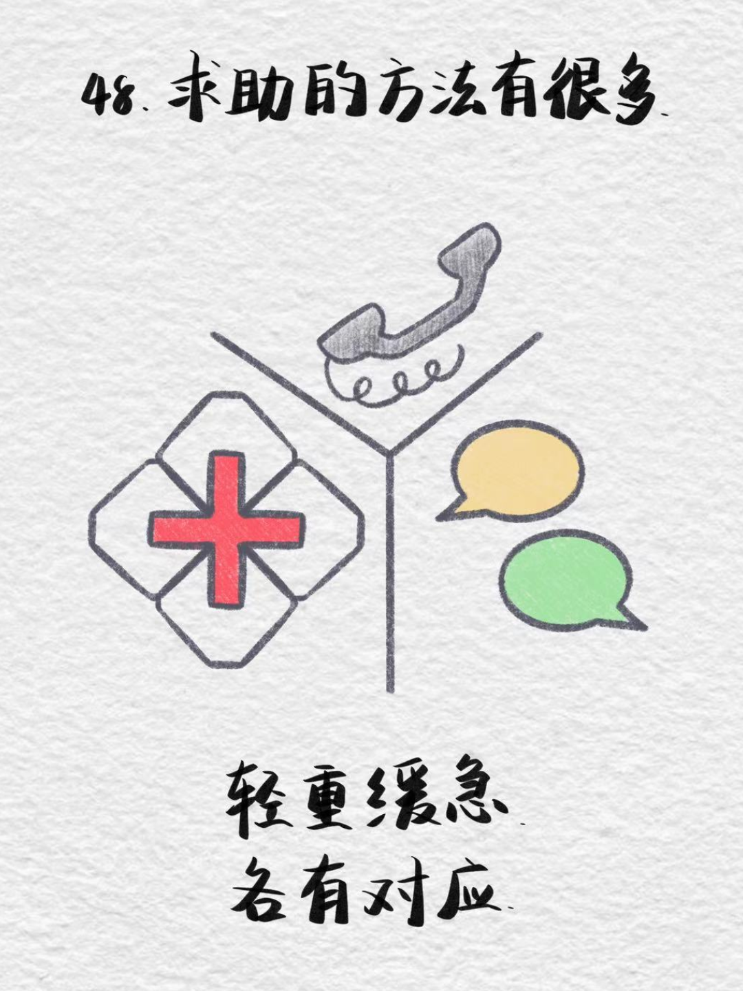 48.求助方法有很多。你们可以求助学校的心理健康教育中心,也可以寻找专业的咨询机构或者医院的精神科⚙️🙋🏻♀️。当然,如果问题较轻,向你身边信赖的人寻求帮助也是一种非常不错的方式🦹🏻♀️,如果你自已已经无法化解,希望你们尽快去专科医院寻求心理治疗,同学们不用太担心药物的副作用,用药前两周会有较大的副作用反应,之后就会逐渐消失,用药后千万不能随意停药或者减药,一定要遵医嘱,这是非常重要的哦👨👨👦!