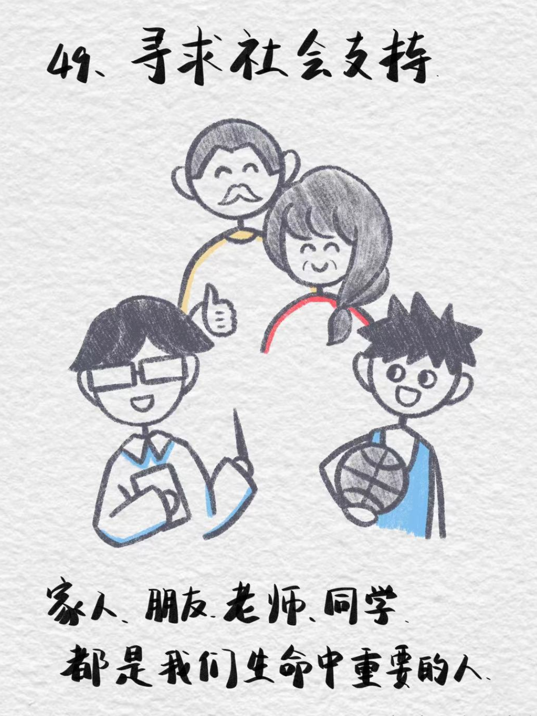 49.寻求社会支持。同学们👩👧👦,我知道你们在学校心灵受伤后不想让父母担心,不想让学校知道👆🏽,不想让辅导员知道,甚至不想让同学和朋友知道👩🏭。但你要知道父母是我们最温暖的港湾,我也知道你们怕他们担心🧔🏼,怕他们不理解,甚至担心他们会认为你装病,你选择自己承受,可是此时的你心里比任何时候都脆弱🥷🏽🧜🏼,比任何时候都渴望父母的理解与支持。有心理困扰后,你不敢让学校老师知道,你不敢让宿舍同学知道👩🏻🙋🏻♂️,你也不敢让朋友知道,担心大家知道后会把你当做异类,会疏远你👨🏽🎤,可是这样的你真的很痛苦👶🏻,你的生活被限制了,你甚至回避各种社交。有心理困扰后,你不敢去寻求专业的心理咨询或者心理治疗帮助,因为你觉得心理咨询没有效果➕,你担心自己的问题被暴露,你担心学校会对你采取一些特殊措施,使自己的问题更加曝光出来,你更不敢去医院看精神科♓️,因为你不敢接受那样的结果🦙,你怕那个标签,你更怕药物有严重的副作用。可是👨🏿🦲,同学们👷🏿♀️,你们知道吗🤞🏼?家人、朋友👨🏽🌾、同学、老师,他们其实都是我们生命中最重要的人。如果你可以坦诚的向他们表达自己的情况,向他们诉说你的渴望🧑🏽🔬,大家会更愿意选择去帮助你🤟🏼,你的症状可以在这些温暖之中缓解很多。