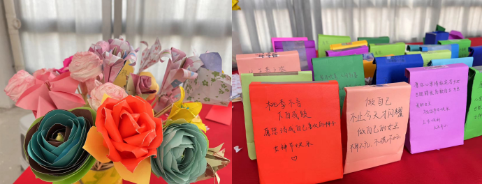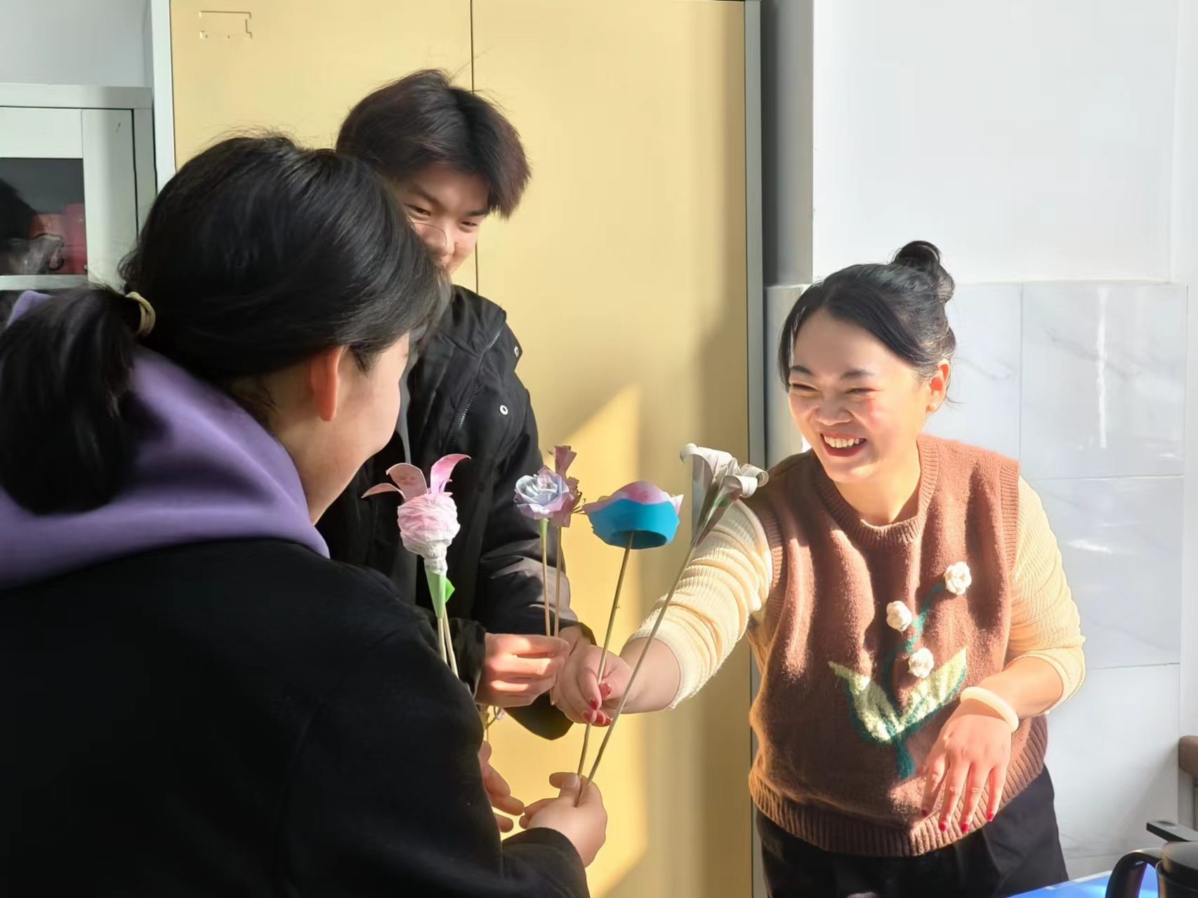 活动中,同学们精心设计了美丽别致的手工艺品👷🏻♀️。他们用餐巾纸做成的纸巾玫瑰和折纸百合含苞待放🧹,用卡纸制成的精美礼袋,里面装着充满惊喜的“糖果盲盒”。礼物虽轻😵💫,胜在心意。办公室🧑🏻🦱、宿管休息室💮、讲台上……学生们把一枝枝美丽的花朵和一个个充满祝福的礼袋送到女老师们手中,感谢她们为学校的发展贡献了智慧和力量,她们无不惊喜又感动,幸福的暖流弥漫在整个校园💇🏿。