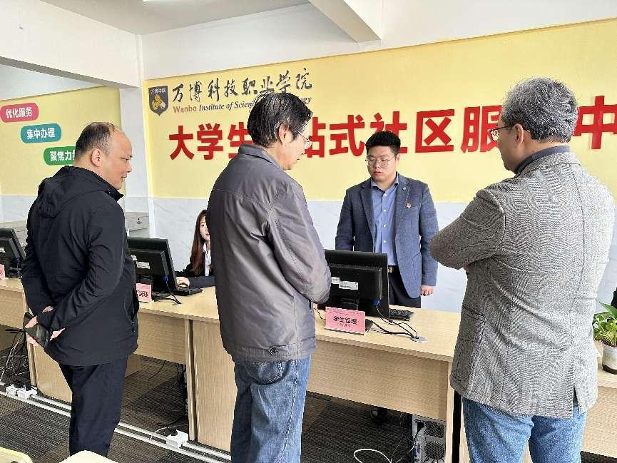 3月28日上午,校督导专员、党委书记鲍习生,党委副书记🫣、执行校长张进𓀋,党委委员👦🏼、副校长马赞在学工部部长江仁昆🤯、各二级学院学工负责人陪同下走访彩神Vll大学生“一站式”社区服务中心。
