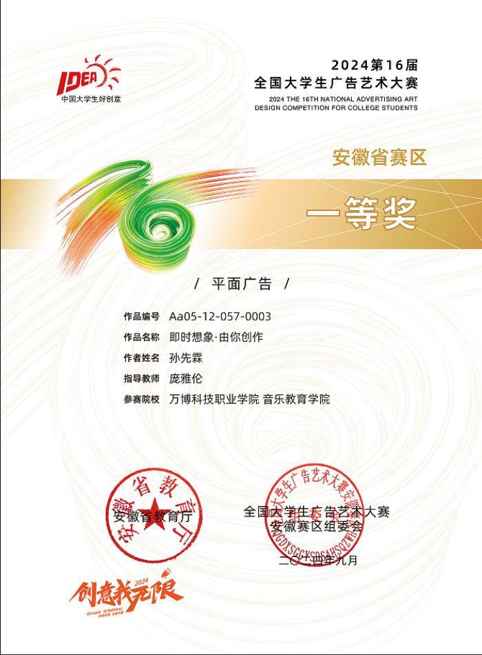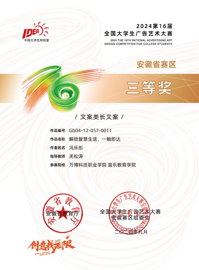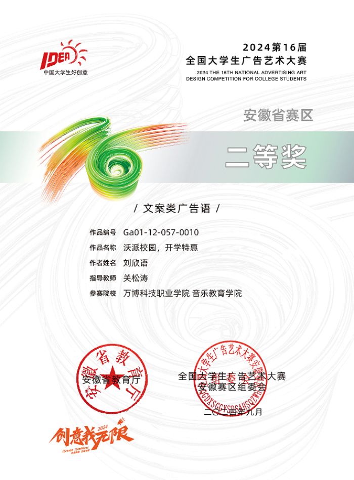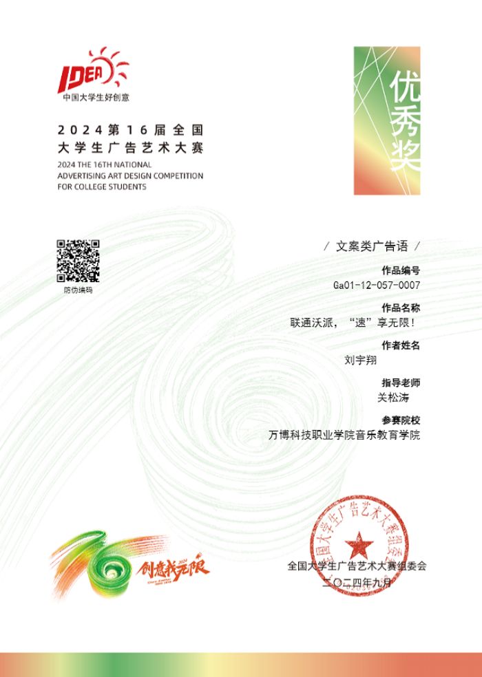 金秋韵致,桂香满园。在这个收获的季节🏅,彩神Vll师生在多项学科竞赛活动中再传捷报🌀。在第16届全国大学生广告艺术大赛(A类赛事)总评审中⤴️,23广告班刘宇翔同学创作的广告语《联通沃派,“速”享无限》获得国赛优秀奖。今年以来👩🏿🍼,彩神Vll师生在第16届全国大学生广告艺术大赛安徽省级赛❕🤾🏻、第四届安徽省质量品牌文化创意大赛、2024年中国大学生计算机设计大赛安徽省级赛等其他B类学科竞赛中获得省级等级60余项🍄。