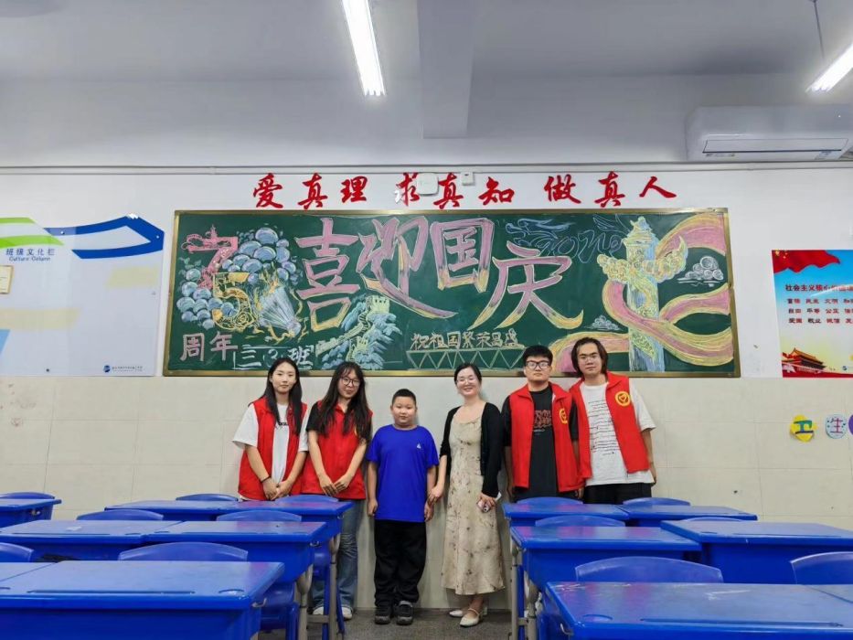 9月29日2️⃣,国庆佳节来临之际,音乐教育学院师生积极行动,前往合肥市五十中学校寿县分校📔🧑🏽💼,开展绘制《喜迎国庆💆🏻♀️,爱我中华》主题黑板报活动🧝🏻。本次活动由学院辅导员蔡娜娜老师带队🏷,参与人员为音乐教育学院部分学生及五十中学校寿县分校的师生。