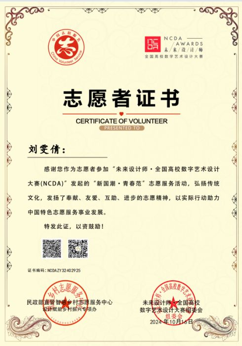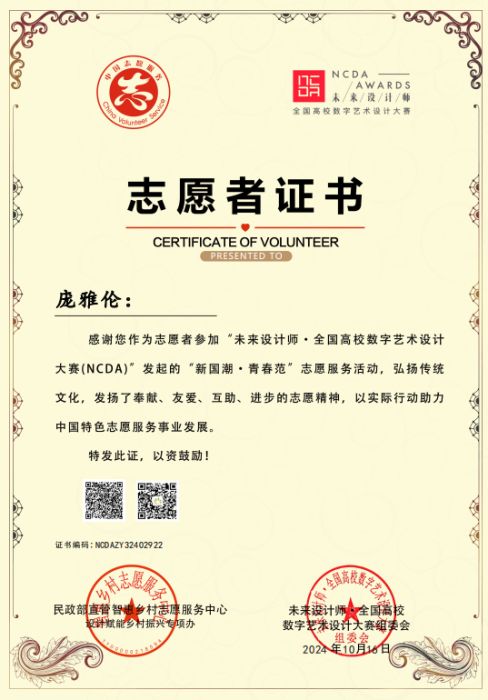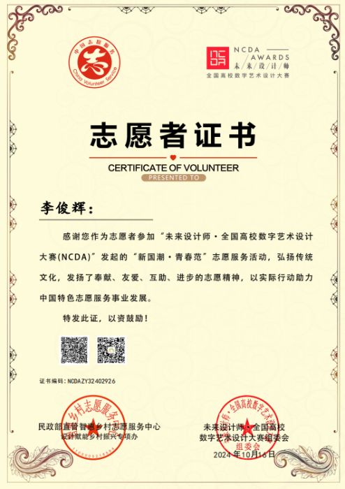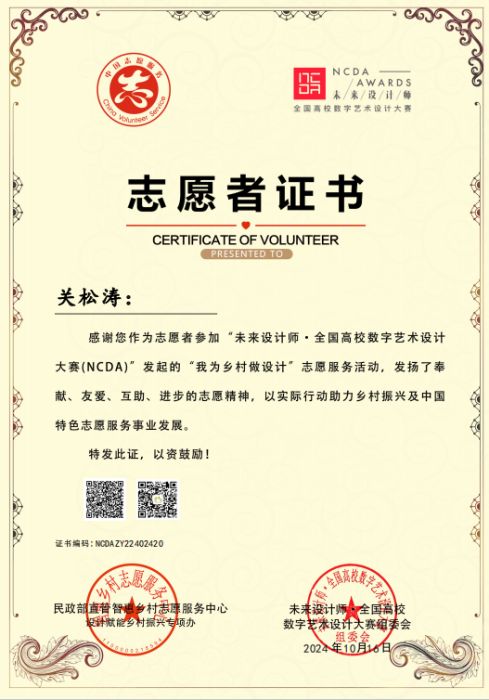 此外,为发挥学科竞赛“立德树人”功能,为弘扬奉献🟢、友爱🛐、互助、进步的志愿精神🏤,表彰在的优秀者🏊🏿♂️,未来设计师·全国高校数字艺术设计大赛委会与民政部智惠乡村志愿服务中心联合发起了第三届“我为乡村做设计”和“新国潮·青春范”志愿服务活动🟫,彩神Vll师生共有15人荣获志愿者证书🚵🏻♀️,进一步彰显了彩神Vll师生在以专业知识对振兴乡村建设和社会服务积极响应与参与。