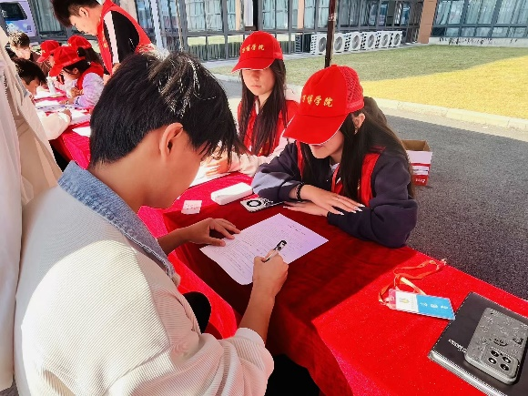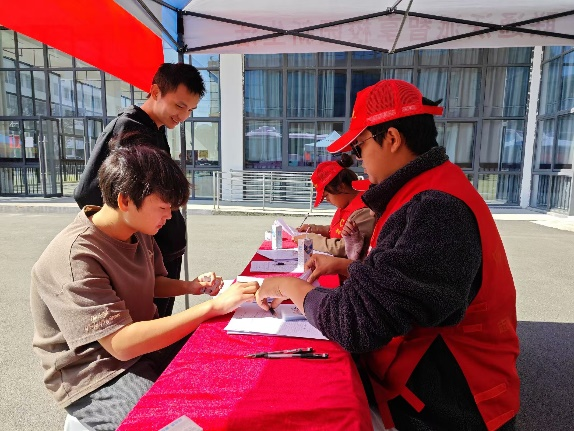 活动现场👌🏼,志愿者提前到达活动现场,紧锣密鼓的搭起帐篷、布置现场。志愿者为同学们普及献血知识🚵♀️,协助他们填写表格🫦。在体检环节,医护人员细心地为同学们测量血压、检查血型等,同学们积极配合,现场井然有序。