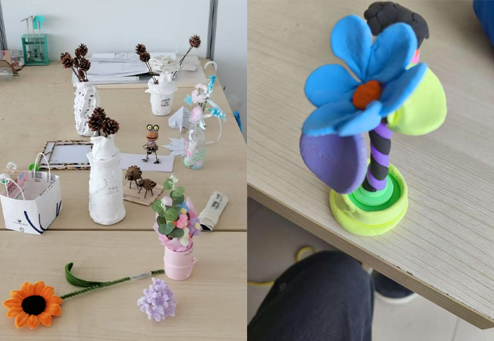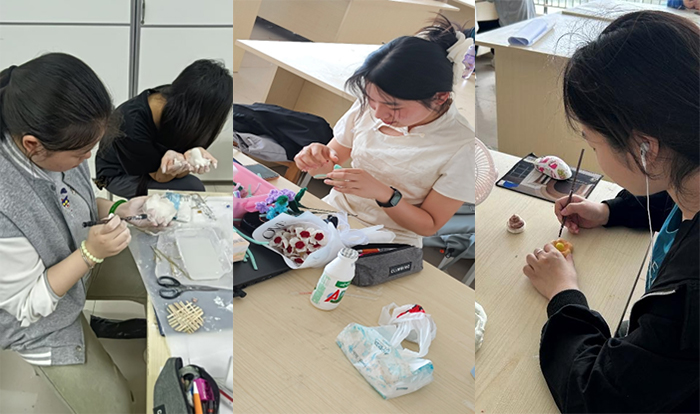 与旧物改造形成呼应的是“非遗泥塑”实践环节。泥塑作为国家级非物质文化遗产⛔,拥有悠久的历史与丰富的表现形式。指导教师现场授课,向学生详细讲授泥塑的历史起源、技艺流程、造型语言及文化寓意➙。在老师的演示下🙅🏻♤,学生们学习了基本的捏制技巧,如搓条、压塑、拼接👩🏽、刻花等传统工艺🖖🏻🙎🏿。在初步掌握造型手法后🧑🎓,学生被分组进行创作,围绕“传统文化”“绿色生活”“空间意象”三大主题,展开自由表达。