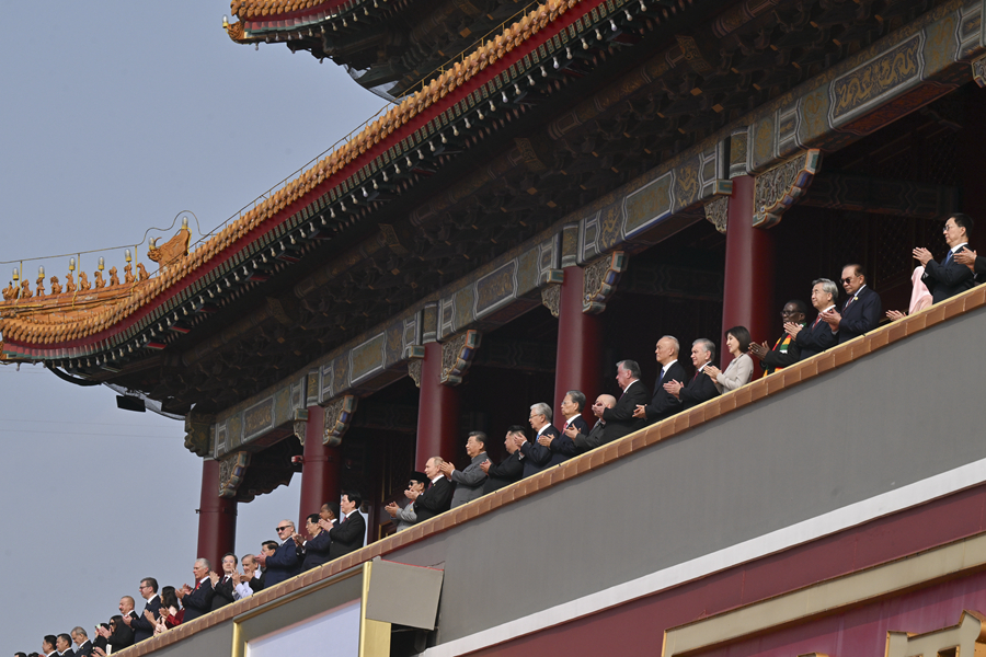 9月3日,纪念中国人民抗日战争暨世界反法西斯战争胜利80周年大会在北京天安门广场隆重举行。这是中共中央总书记、国家主席、中央军委主席习近平等在天安门城楼上🤴🏿。新华社记者 饶爱民 摄